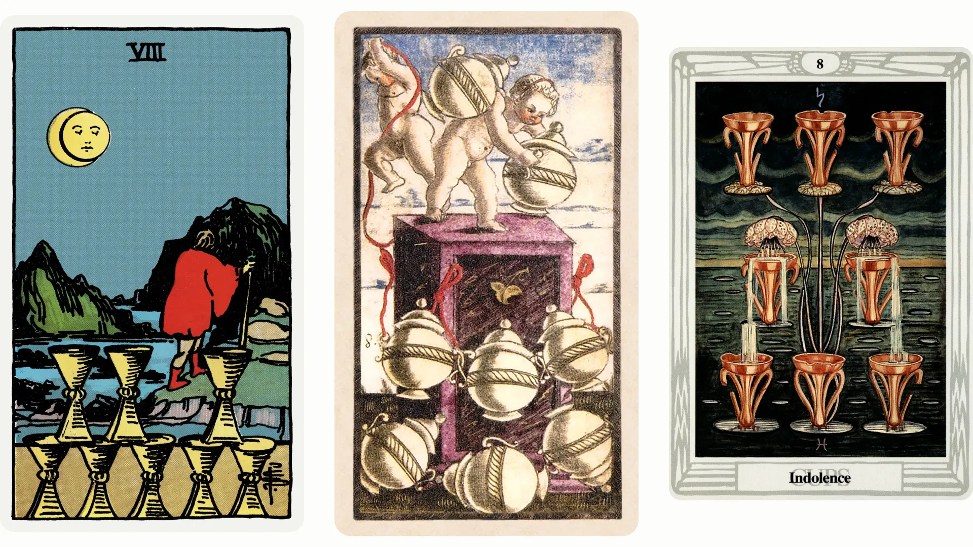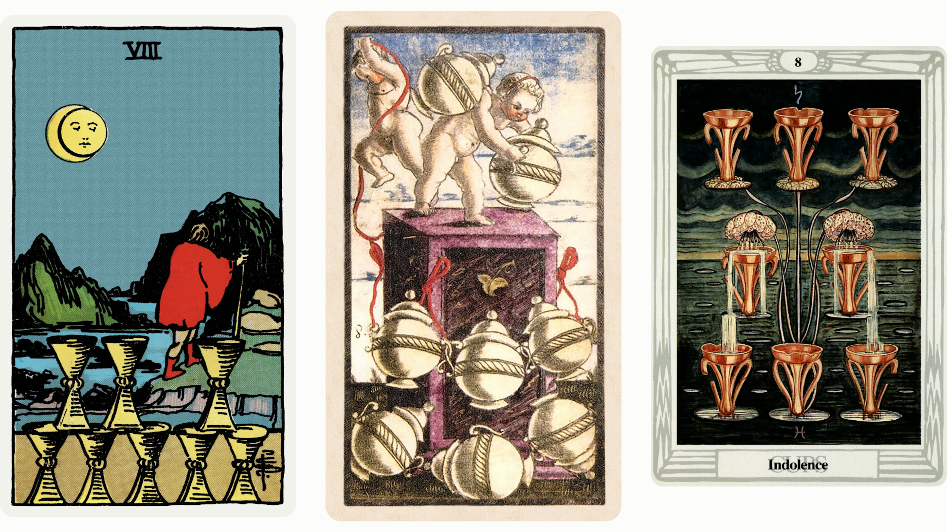 In the classic Rider Waite tarot deck, the eight cups in the foreground of this card are arranged so that one appears to be missing on the top row, which gives us a clue as to why the figure in red appears to be walking away. The cups, which are arranged like trophies, represent meaningful accomplishments and life experiences, and yet the implied absence of one cup suggests that something important is missing.
