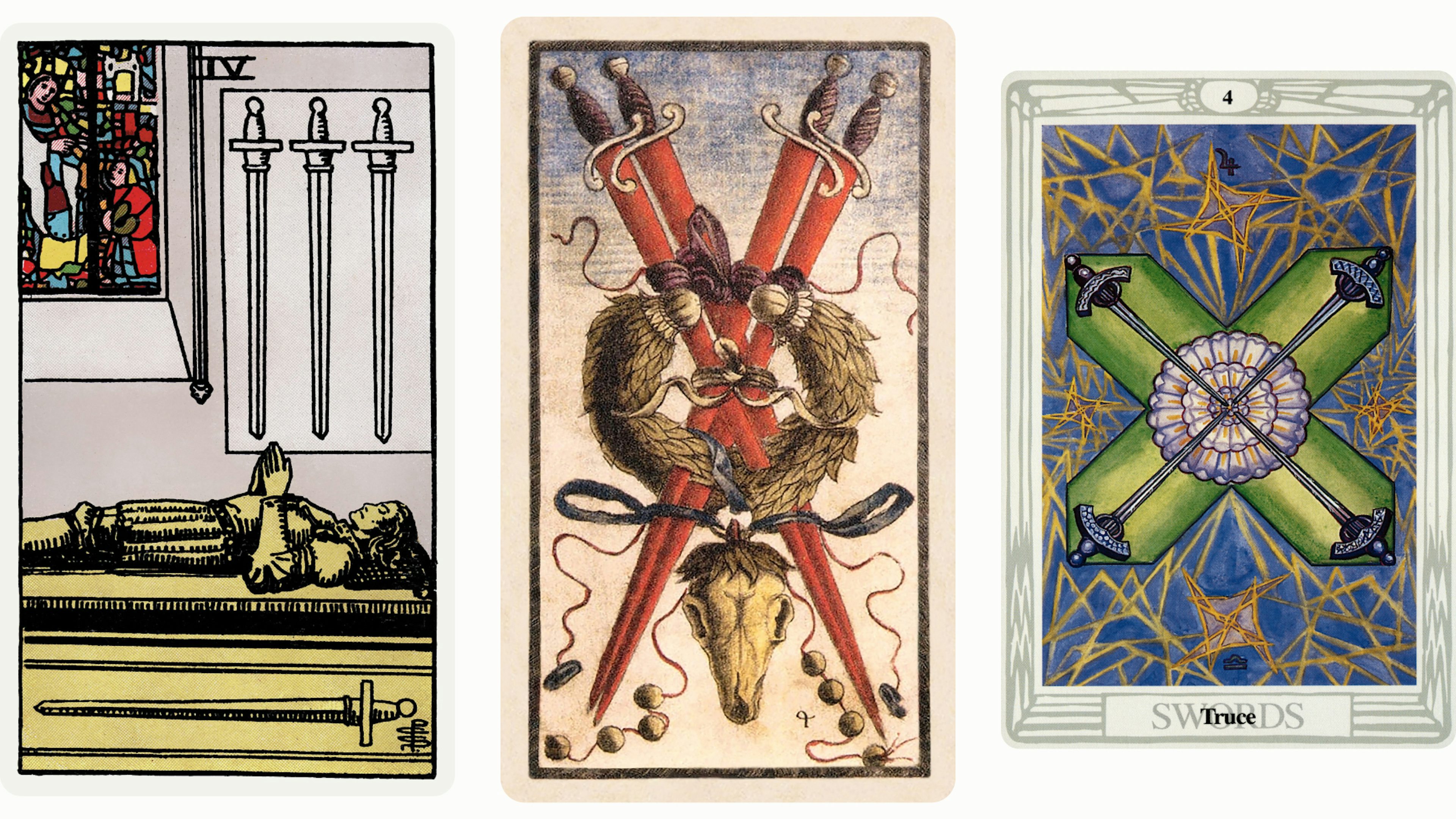 Where the key tarot meanings of the Major Arcana focus on life’s overarching themes and events, Minor Arcana cards like the Four of Swords explore and reveal the more subtle changes impacting one’s day-to-day life and near future. The Four of Swords also bears similarities with its sibling cards the Four of Cups, Four of Pentacles, and Four of Wands, in that all four deal with matters of order and stability.
