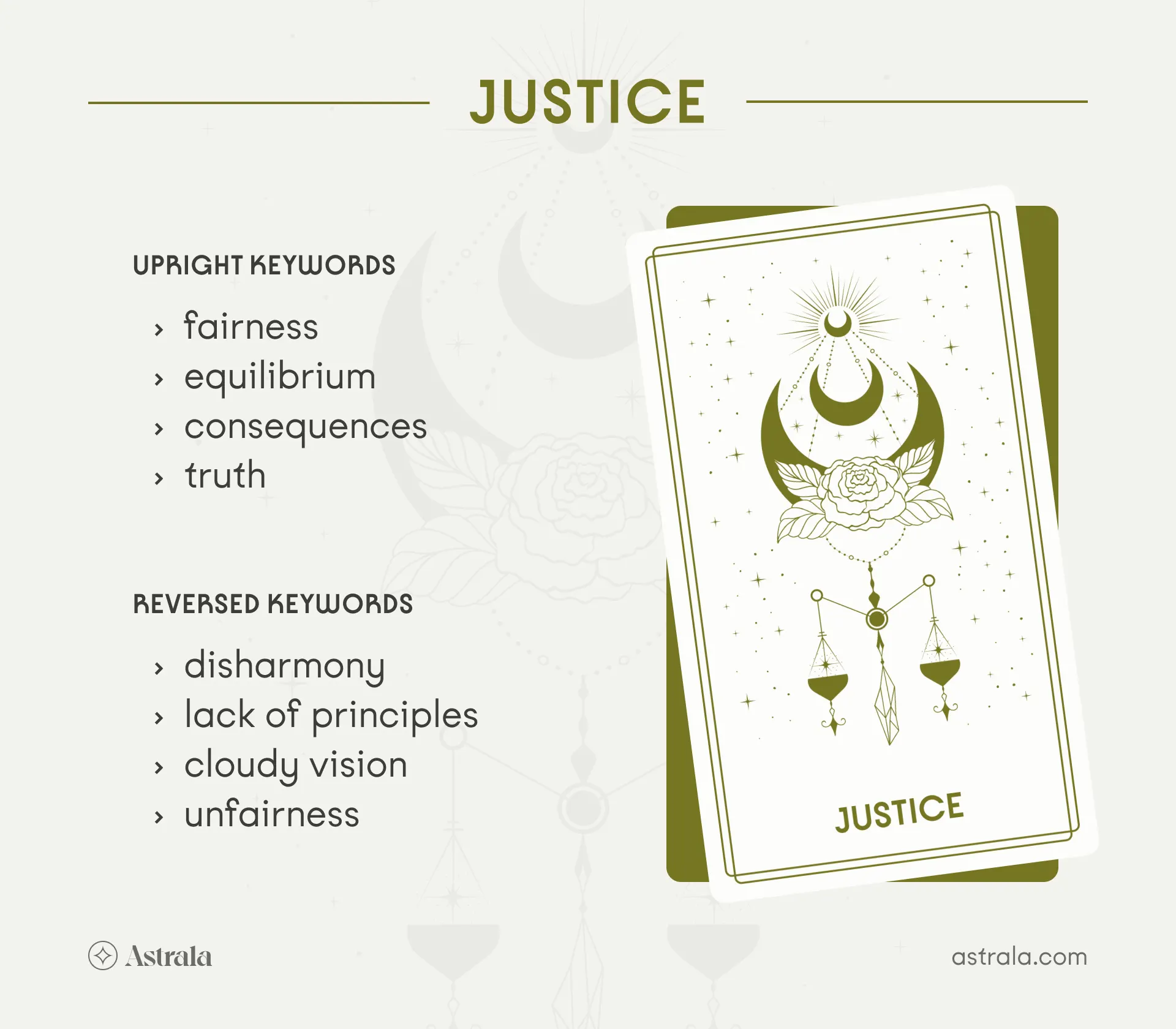 Justice is the 11th Major Arcana tarot card and represents fairness, balance, and ethics. The figure of Justice holds a perfectly erect sword pointing towards the heavens, indicating that her discrimination is in alignment with Truth. In her other hand, she holds a pair of scales, which she uses to make a balanced decision that weighs all factors.