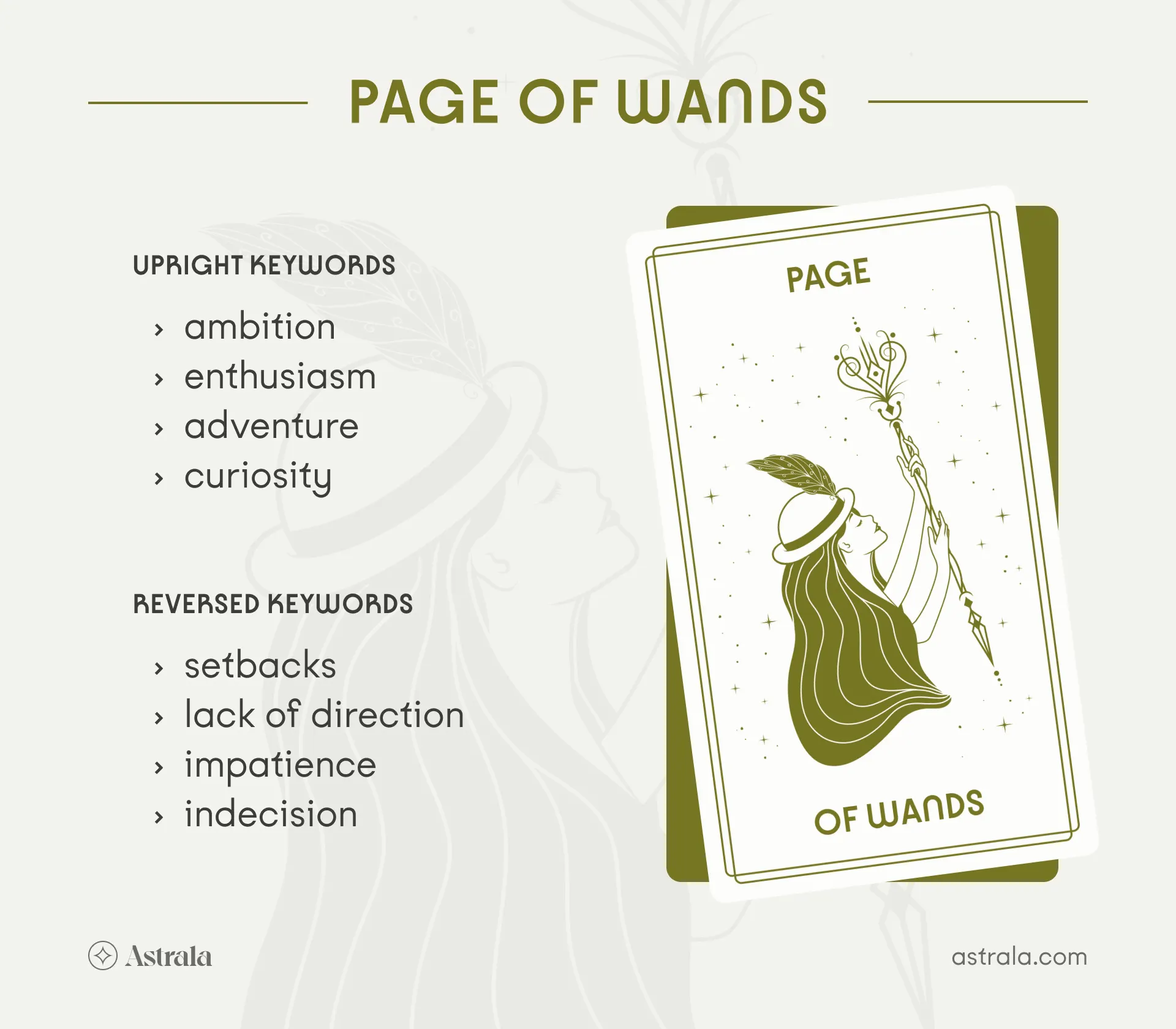 He is a free spirit filled with aspirations of greatness and the desire for growth, exploration, and new adventures. It only makes sense, of course, that the Page of Wands is associated with the element of Fire and the astrological zodiac sign Sagittarius — as well as the growth and opportunities brought by ruling planet Jupiter.