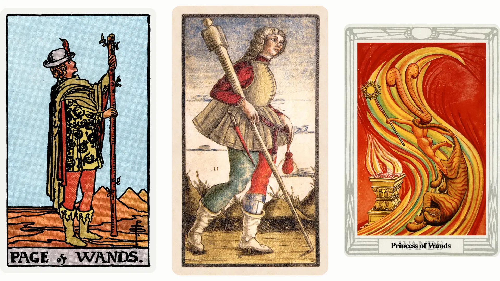In the Rider Waite Smith tarot deck, a youthful Page looks upward in admiration at a tall wand, symbolizing the dreams he has for the future and his desire to expand his world. The young man hopes to one day be able to wield this wand with confidence, both literally and figuratively. He’s pictured in a desert landscape, symbolic of his element (fire, which is dry and hot) and also of his plans, which have yet to bear fruit.