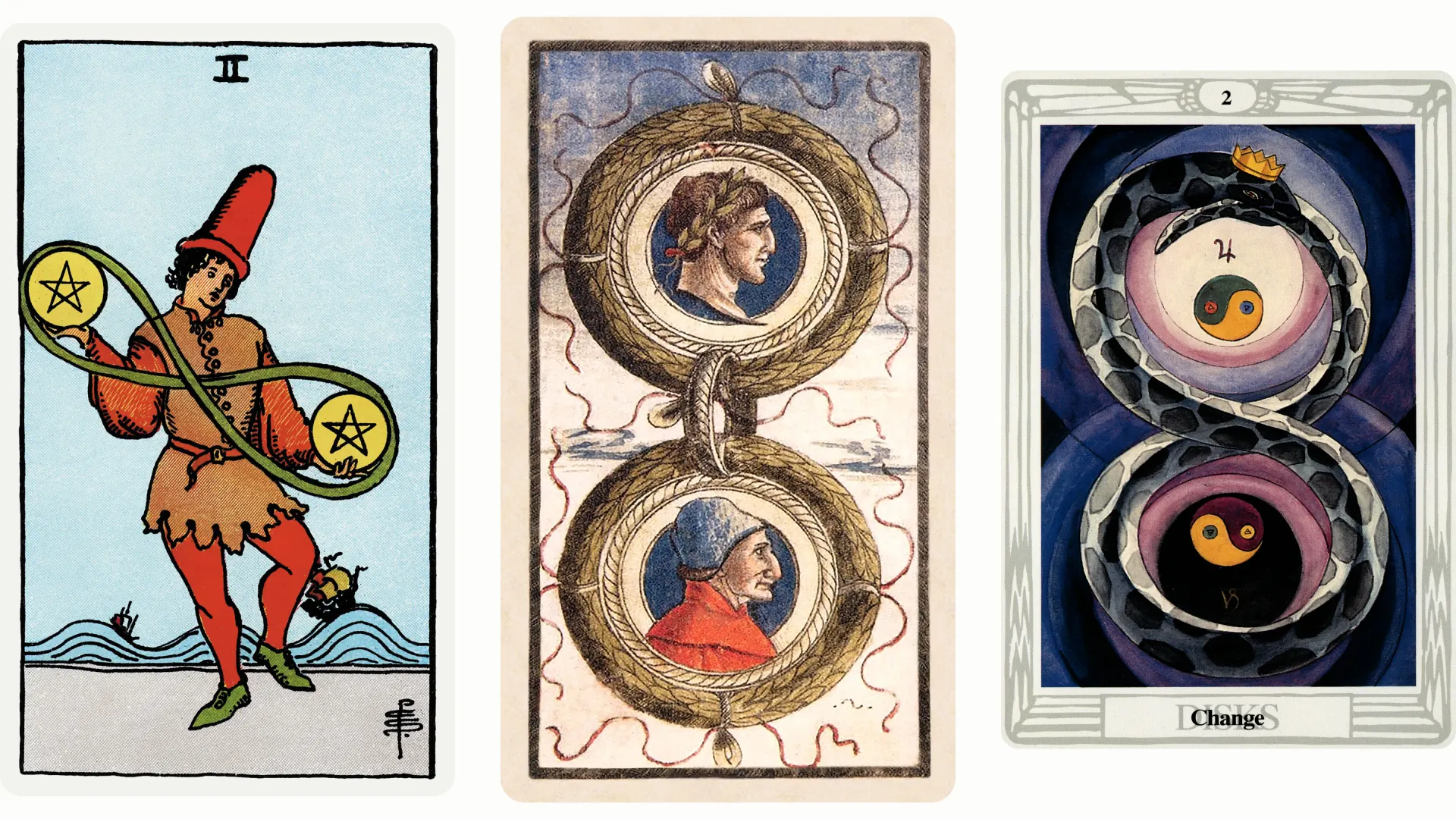 Where the key meanings of the Major Arcana focus on life’s overarching themes and events, Minor Arcana cards like the Two of Pentacles explore and reveal the more subtle changes impacting one’s day-to-day life and near future. The Two of Pentacles also bears similarities with its sibling cards the Two of Cups, Two of Wands, and Two of Swords, in that all four deal with duality and balance.
